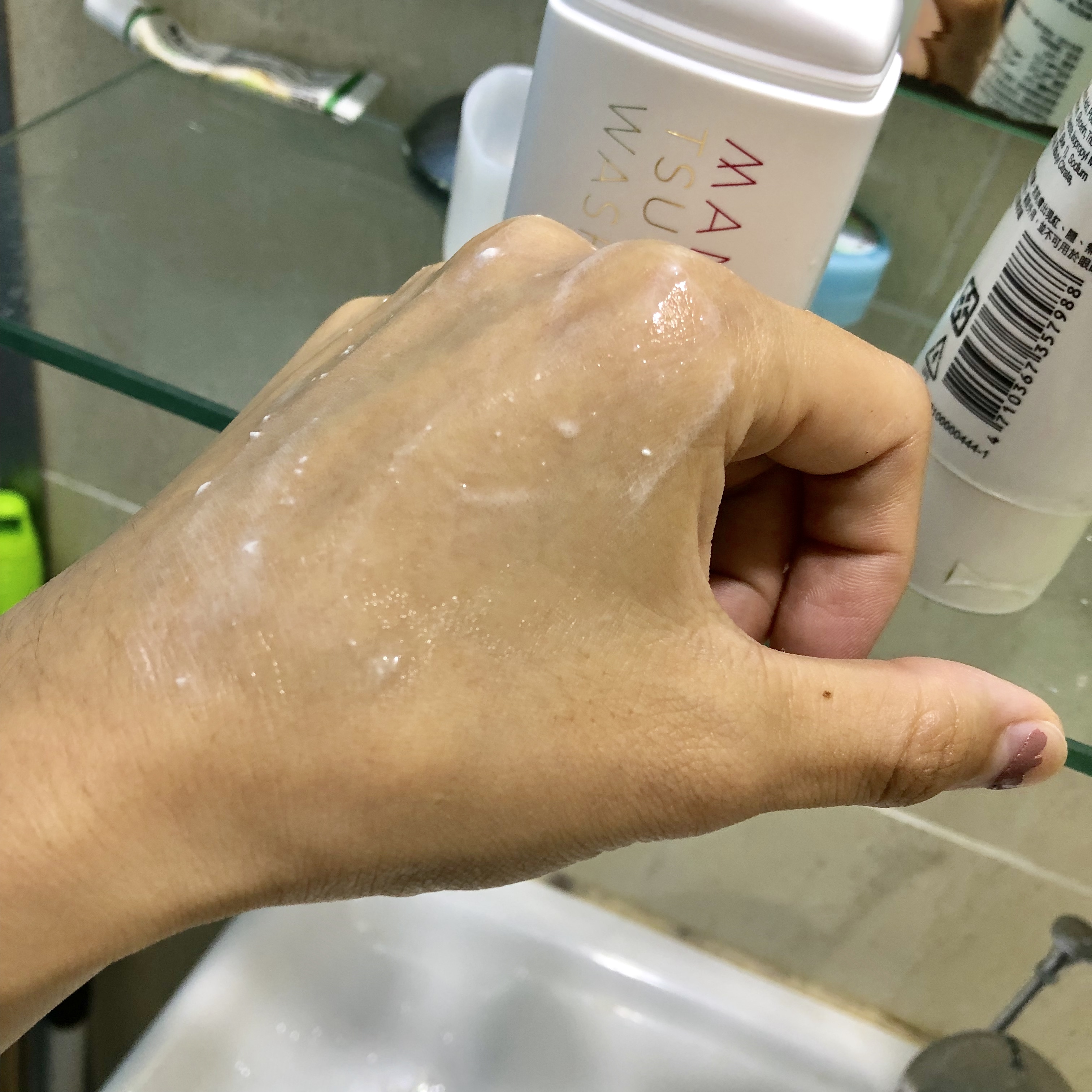 ​於手心倒出後,沾水輕搓即可使用,個人覺得蠻容易起泡的。